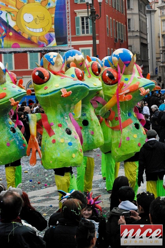 Un grand nombre de niçois et de visiteurs du monde entier étaient venus accueillir en fanfare le Roi de la Planète Bleue. C’est au milieu des confettis que des échassiers et autres danseurs de rues gracieusement costumés se trémoussaient et assuraient l’ambiance festive. Les enfants maquillés et déguisés pour l’occasion s’amusaient tout autant que les adultes qui, eux, y retrouvaient leurs âmes d’enfant. S’ajoutaient à ces derniers les grenouilles vertes couronnées avec leurs grandes mains palmées, réelles figures emblématiques de ce Carnaval 2010. Celles-ci resteront fidèles au poste jusqu’à la fin de cette grande fête de Nice. Les Plasticiens Volants offraient un spectacle unique qu’ils ont appelé “Les racines de la terre et autres planètes”. Des planètes-ballons et des mains immenses flottaient au-dessus de la foule dans un élan majestueux.