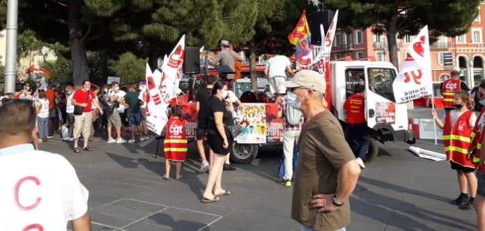 Une bonne partie des troupes ont préféré, semble-t-il, la joie du match France Allemagne. Pour pallier à ce manque, le monde du spectacle n’est jamais très loin. Parmi eux, il y a eu Jean Louis Ruf, délégué CGT Spectacle des Alpes-Maritimes. Musique et chant ont été au programme de cette manifestation en petit comité. Le but est clairement de pouvoir souffler et d’attirer les badauds aux alentours.