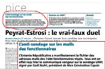 J’ai en effet écrit un communiqué -qui n’a d’ailleurs fait l’objet d’aucun article-, à ma signature, et envoyé à une seule liste de huit rédactions, parmi lesquelles Nice-Matin et Nice Premium. Ce communiqué n’a jamais été envoyé par l’Entente Républicaine, il n’ a jamais été diffusé aux employés Municipaux. Je ne sais pas d’où vient toute cette histoire, je regrette simplement que le journal n’est pas cru bon de vérifier ses sources le moment venu, et que, aujourd’hui, il se croit dispensé de rectifier l’information et de publier un Droit de Réponse. Si ce n’était pas des accusations graves j’en rirais sûrement…