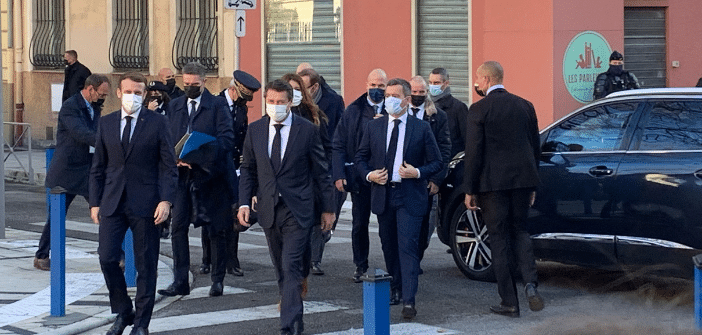 Accompagné de Gérald Darmanin, le ministre de l’Intérieur, de Marlène Schiappa, ministre déléguée à la citoyenneté, le chef de l’État est arrivé à 11h à Nice devant l’ancien hôpital Saint-Roch. Ce lieu sera dans quelques années transformé en une infrastructure unique en France, “un hôtel des polices” dont la construction débutera l’an prochain et finira en 2025.