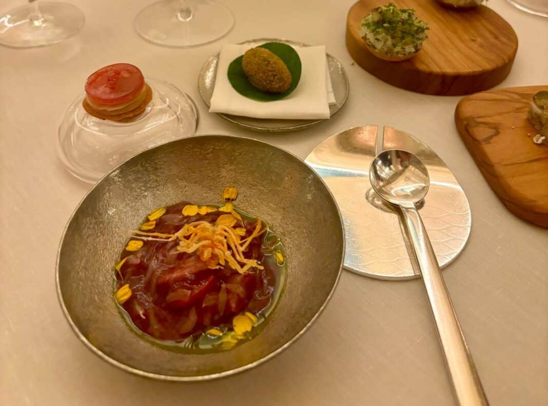- Artichaut, anémone, caviar : artichaut de Provence ‘alla giudea’, anémone de mer d’Olivier Bardoux, burrata et caviar.