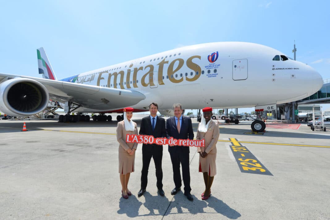 L’avion qui a atterri ce jeudi à Nice s’est présenté avec la nouvelle identité visuelle de la compagnie et une livrée aux couleurs de la Coupe du monde de rugby 2023 en France, dont Emirates est le sponsor mondial. Il s’agit du même A380 qui a récemment transporté le trophée Webb Ellis, qui sera remis à l’équipe vainqueur de l’épreuve à l’automne prochain, depuis l’Afrique du Sud, en passant Dubaï, jusqu’à Paris. Les passagers Emirates pourront d’ailleurs regarder tous les matchs de la coupe du monde en direct durant leur vol.