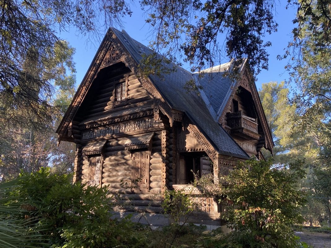 L’histoire de cette isba commence dans les années 1870. Le baron Paul Von Derwies, homme d’affaires russe, commande une maison traditionnelle en bois sur ses terres d’Ukraine. La construction est ensuite démontée, transportée par train depuis Kiev, puis reconstruite dans son domaine niçois. L’édifice devient un lieu de réception. Les invités découvrent, au milieu des jardins de la colline de Cimiez, une habitation typique des campagnes russes.