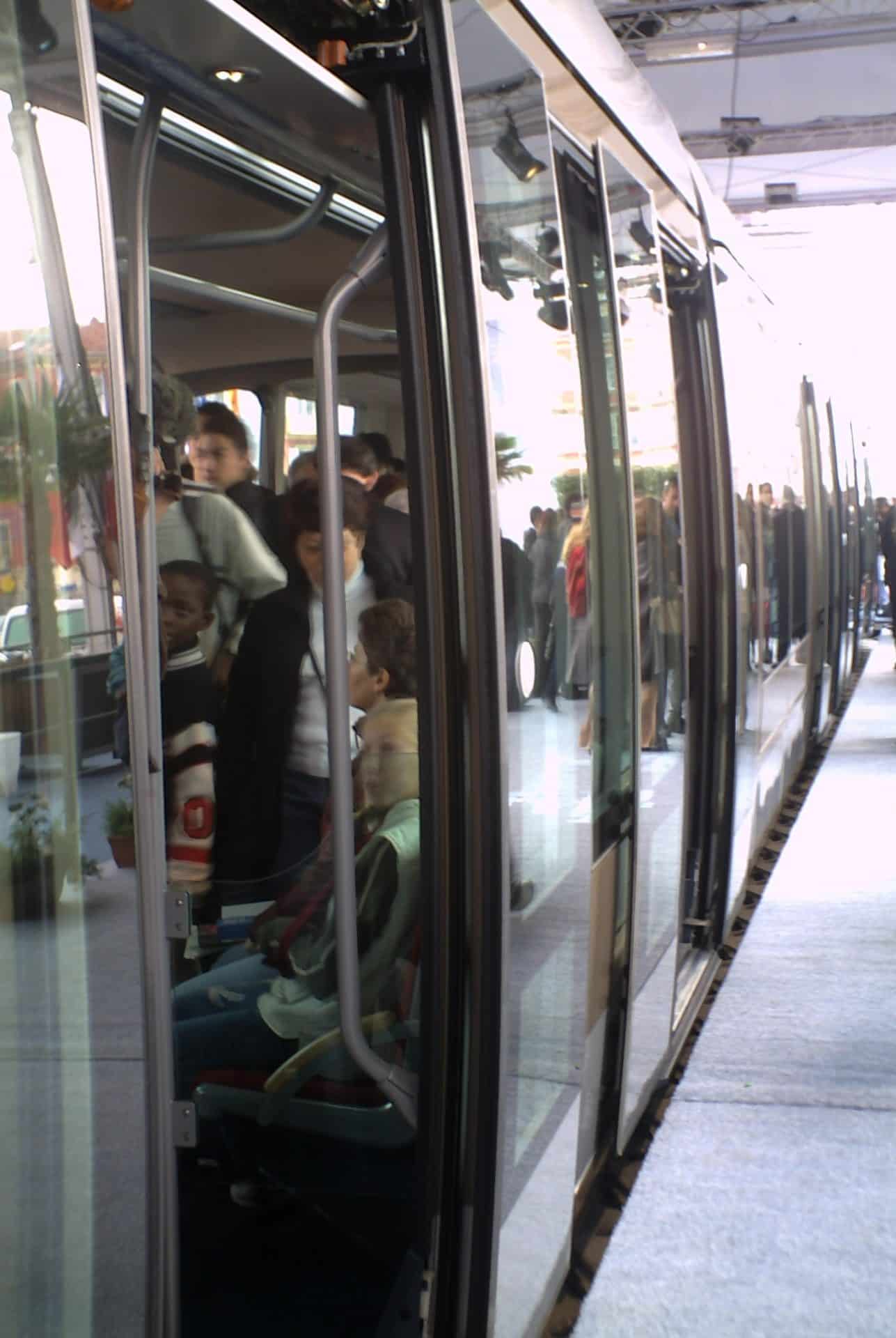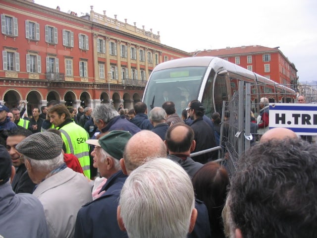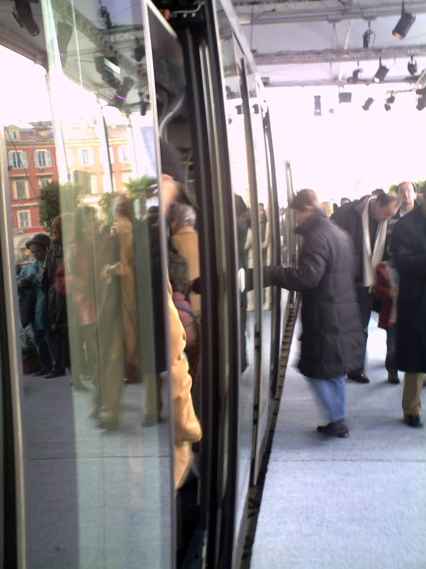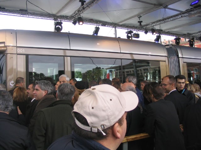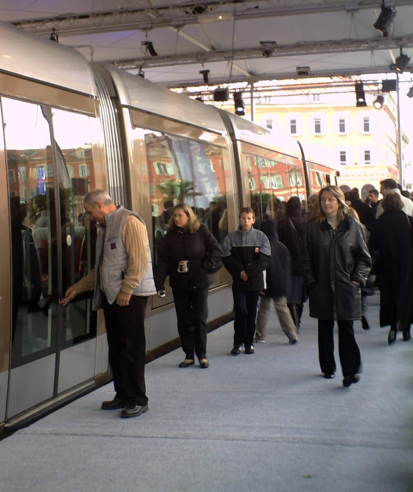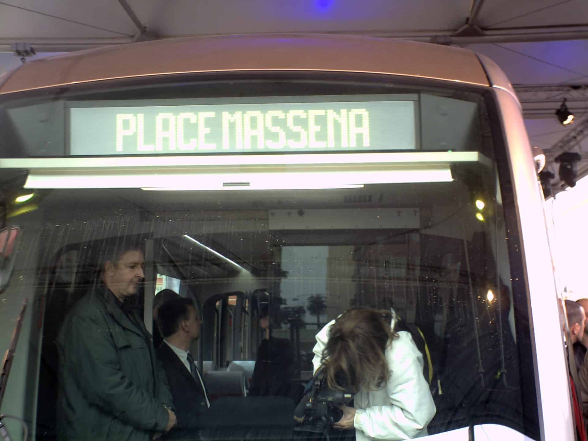 Une foule importante s’est massée sur la Place Masséna samedi matin malgré le temps. « Mariage pluvieux, mariage heureux », s’amuse à déclarer le Sénateur Maire de Nice Jacques Peyrat. Lui, comme les autres hommes politiques, ne sont pas les vedettes de cette matinée particulière qu’attendait grand nombre de Niçois depuis longtemps. Les flashes crépitent à son entrée musicale sur la Place Masséna. Les journalistes la suivent et lui consacrent des émissions spéciales sur les ondes et dans la petite lucarne. Cette star n’est autre que la rame du tramway. Il a fallu patienter pour apercevoir le bout de son museau. Elle a défilé dans Nice pendant plus de trois heures depuis le centre de maintenance du tramway au Terminus de Nice-Nord. Un emplacement spécial lui a été prévu, telle une grande actrice qui a sa suite dans les palaces. Elle est choyée. Elle sera exposée jusqu’au 27 décembre.