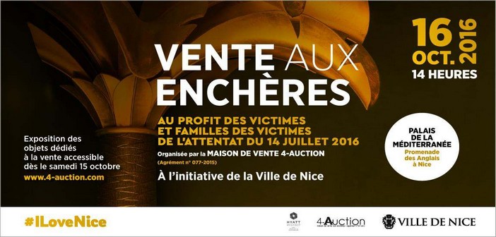 Une Vente caritative au profit des victimes de l’attentat du 14 juillet 2016 sera organisée par la Maison de Vente aux enchères 4-Auction, sous le haut patronage de la Ville de Nice, ce dimanche 16 octobre à 14 heures, au Palais de la Méditerranée sur la Promenade des Anglais.