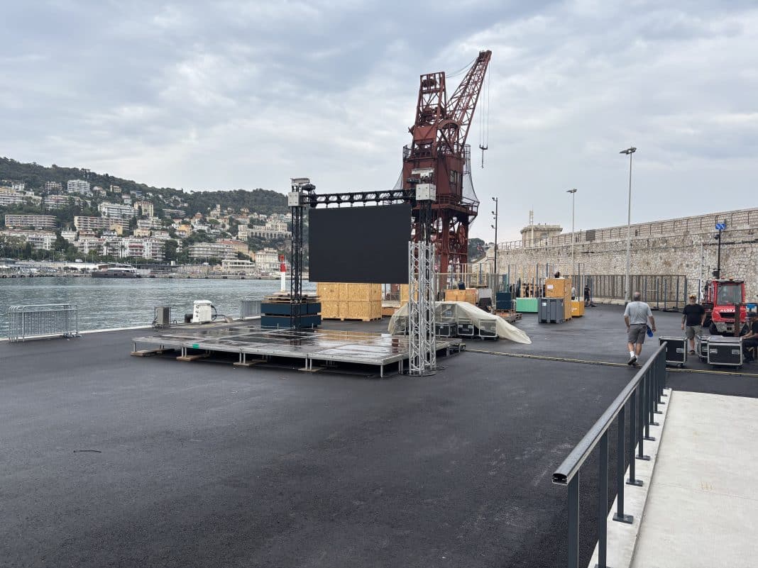 Quelques minutes plus tard, la pluie a cessé de tomber sur le port niçois. Le ciel reste tout de même menaçant. Cela n’effraie pas tout le monde, certains bateaux sortent du port, malgré une météo légèrement capricieuse. Cette dernière ne freine pas le déroulé de l’installation. Tout doit être opérationnel, pour ce jeudi à 16 heures.