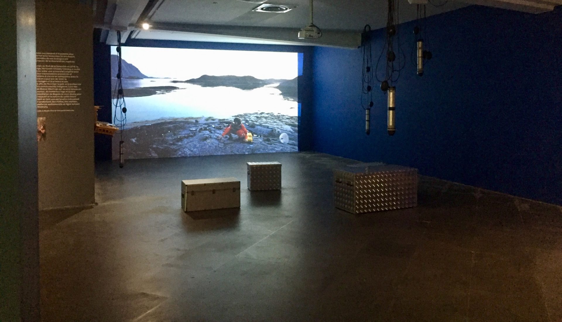 C’est une salle plongée dans l’obscurité qui accueille l’exposition Savoir indigènes – Fictions Cosmologiques, et pour cause ici, on ne trouve ni tableaux, ni sculptures mais des œuvres vidéo. Pour la première fois en France, une partie du travail d’Ursula Biemann est donc mis en avant, à travers plusieurs installations vidéo, allant de neuf à trente-huit minutes. Des installations qui font voyager les spectateurs à travers le monde : forêts d’Équateur, Bengladesh, Canada, Norvège ou encore dans les profondeurs du monde sous-marin.