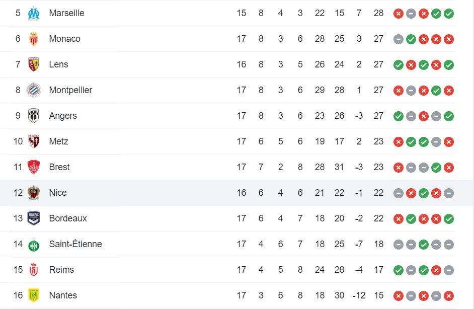Le Gym à la 12e place du classement Ligue 1, à six points de l’OM.