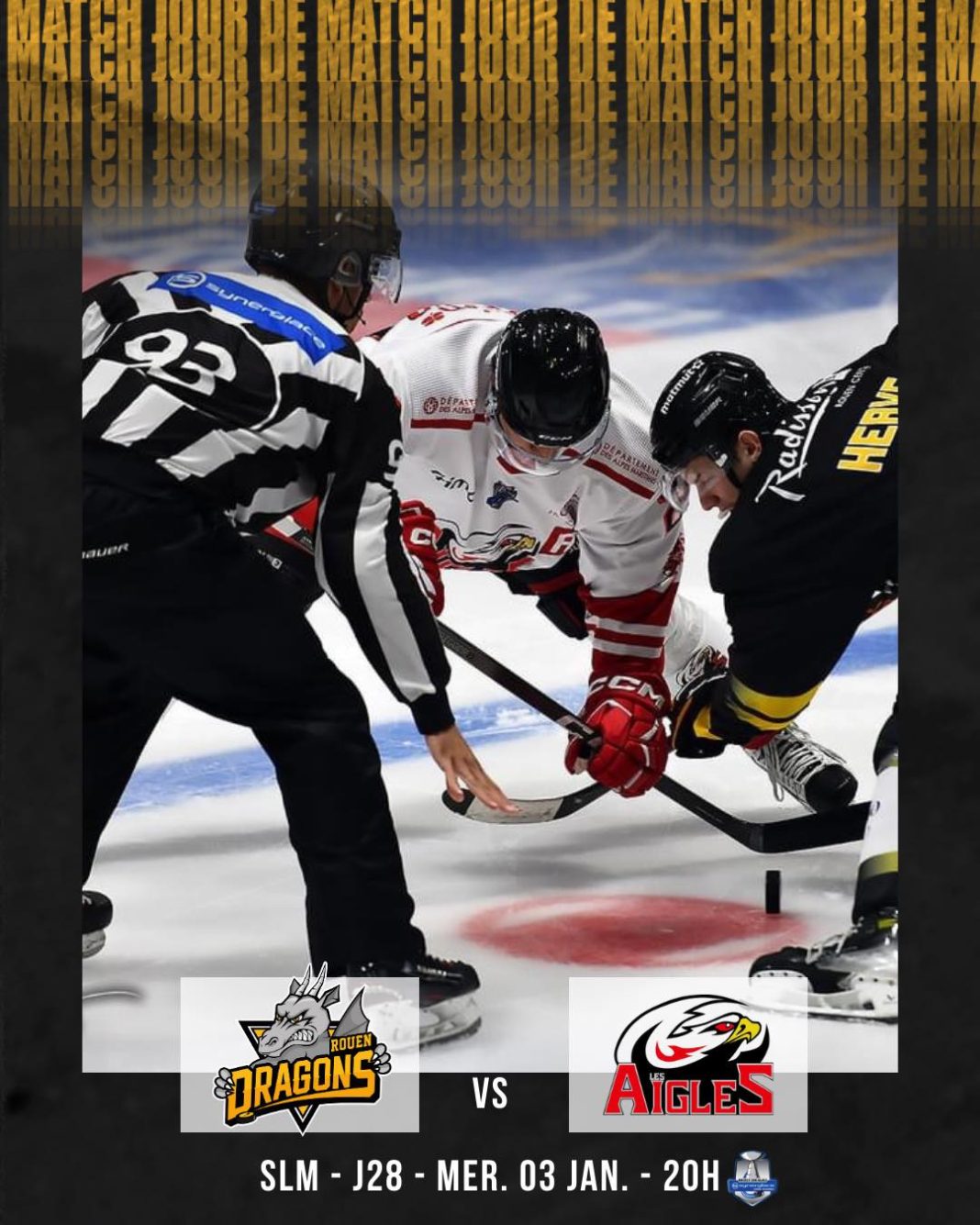 Troisième et dernier tiers temps. La rencontre continue de plus belle avec Nice qui ne laisse pas la défense de Rouen souffler. Des contre-attaques permettent aux Aigles de se montrer dangereux et mettent en difficulté les rouennais. Nice joue sur les relances, ils cherchent à forcer l’erreur pour pouvoir prendre l’avantage dans ce match. Une tactique qui n’arrive pas à porter ses fruits. Rouen a réussi, à partir de la 9e minute, à inverser la cadence et c’est à son tour de mettre un pressing sur la défense niçoise. Puis à la 17e minute, les Dragons marquent sur une magnifique lucarne. Le score est de 4:3 et les espoirs de victoire des Aigles s’éloignent. Pour ne rien arranger à 1 minute 40 de la fin du temps règlementaire Quentin Tomasino vient marquer le 5e but rouennais. La victoire pour Nice s’envole, score final 5:3.