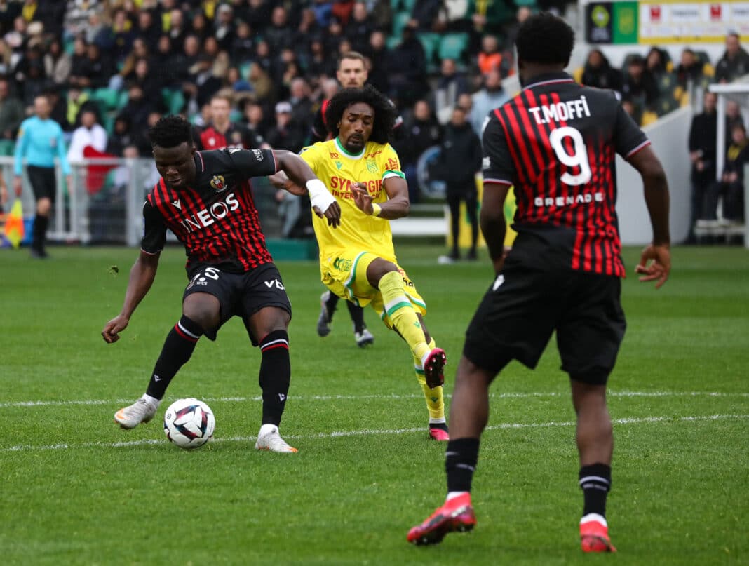 Dès le coup d’envoi de ce match, les hommes de Didier Digard ont pris le contrôle du jeu. Très vite, les Niçois se sont procuré une première occasion signée Bouanani (4e) qui donnera corner. Sur le coup de pied arrêté, Terem Moffi surgit pour ouvrir le score d’une belle tête piquée après seulement 5 minutes de jeu. (0-1). Même après ce but rapidement encaissé, les Canaris n’ont pas remis le pied sur le ballon. Il faudra attendre la demi-heure de jeu pour voir Nantes apporter du danger sur le but niçois. C’est l’ex-international Français, Moussa Sissoko qui est à l’origine du réveil nantais, il mettra d’abord Schmeichel à contribution (29e), avant d’égaliser de la tête sur un coup franc de Blas (31e). Portés par ce but du 1-1, les Canaris pensaient renverser la partie dans la foulée en obtenant un penalty. C’est Dante le capitaine niçois qui est à l’origine de la perte de balle et qui commet la faute. Heureusement pour le Blas trouvait finalement la barre transversale (35e).