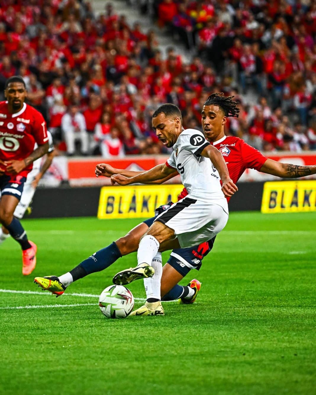 Au point de penalty, Benjamin André prenait le dessus sur Pablo Rosario. La tête du capitaine lillois ne laissait aucune chance à Marcin Bulka (2-1). Le Gym pensait ensuite obtenir un penalty après un ceinturage sur Daouda Traoré. Mais après visionnage du VAR, M.Delajod décidait de ne pas accorder de penalty sur cette situation. Mais les Aiglons n’abdiquaient pas et allaient chercher l’égalisation au bout du temps additionnel. Tom Louchet déposait un super centre sur la tête de Jordan Lotomba (2-2). Les Niçois revenaient dans la rencontre. Et ça ne pouvait pas en rester là ! Sur un ultime contre niçois, Daouda Traoré réussissait un sublime piqué pour remettre le Gym devant. Mais le but était refusé pour un hors-jeu.