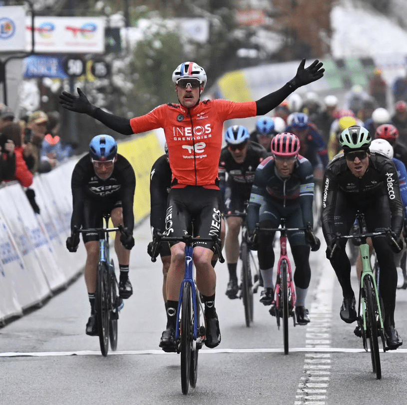 Si le natif de Nice, Nikolas Vinokurov, a également tenté d’attaquer sans avoir la moindre chance, l’étape était promise à un sprinter. Dans un final saupoudré de neige sur le bas-côté ayant potentiellement entraîné de la nervosité et des chutes, c’est le champion de France Dorian Godon (Ineos Grenadiers) qui s’est imposé. Parfaitement déposé par ses coéquipiers, le tricolore a dominé un sprint face à de bons spécialistes de l’exercice. Parmi eux, Biniam Girmay de l’équipe NSM Cycling (maillot vert du Tour de France 2024), deuxième du jour, devant Cees Bol (Decathlon CMA CGM) et Laurence Pithie.