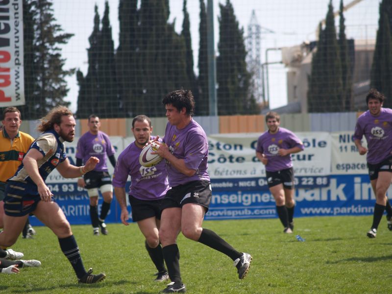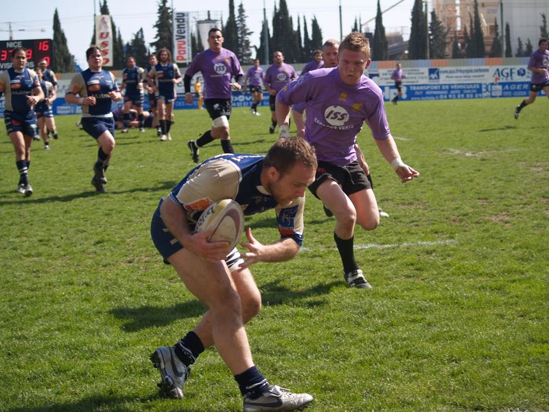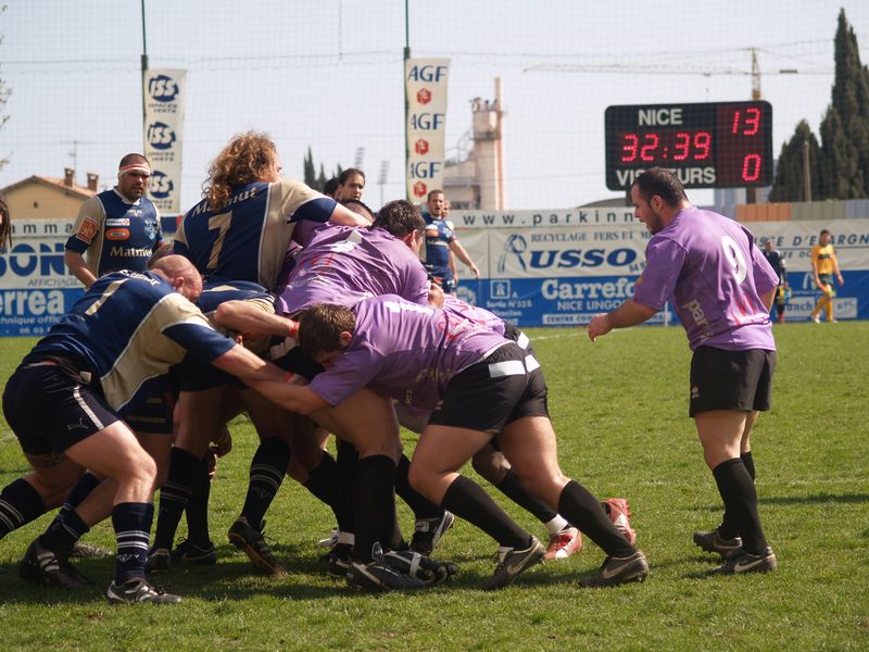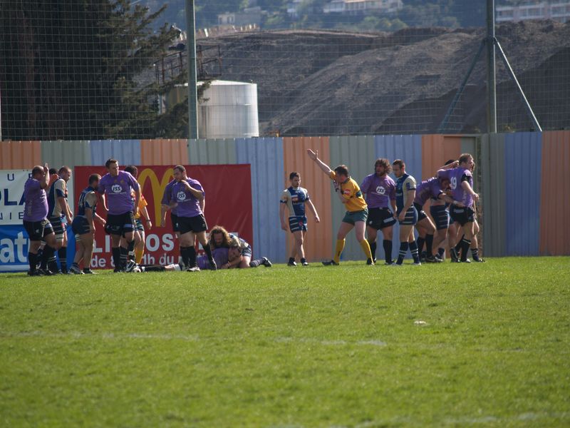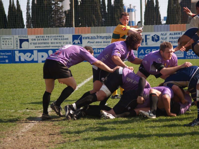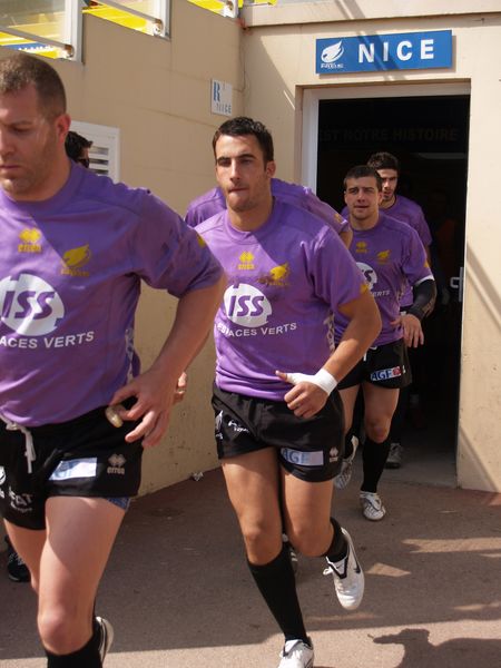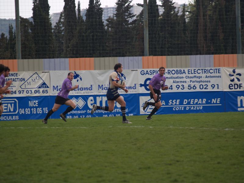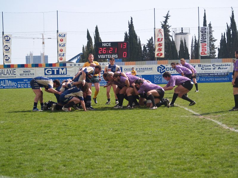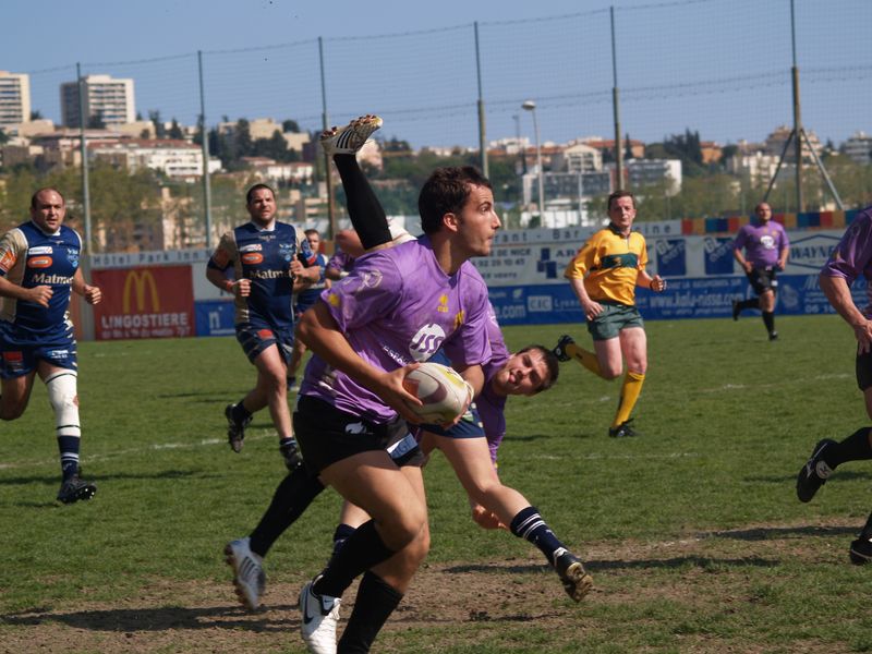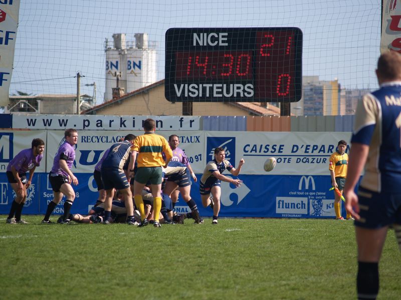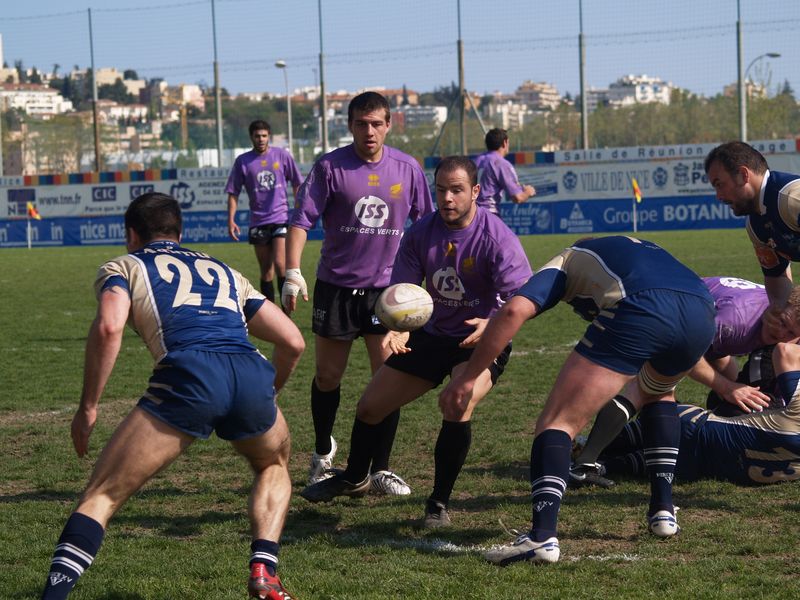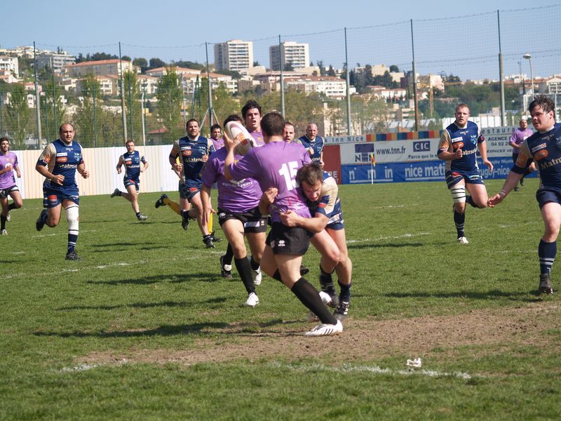 La tribune des Arboras était bien garnie sous le doux soleil printanier et les deux équipes entrent sur le terrain avec des états d’âmes bien différents. Les rouennais joueront l’an prochain en fédérale 1 alors que les niçois espèrent en un repêchage du meilleur troisième pour rejoindre leurs hôtes d’un jour. Les dix premières minutes seront à l’avantage des locaux et c’est en toute logique que Julien Caminati ajuste la première pénalité « entre les pagelles » pour ouvrir la marque : 3-0. La pression est violette avec un jeu bien léché et des phases de jeu bien construites. Personne ne sera surpris à la 19ème minute quand Moxham pointa le premier ballon derrière l’en-but rouennais avec la tranp : sformation de Caminati : 10-0. Les rouennais couraient autant derrière le score que derrière le ballon et Caminati avait même presque pitié en ratant sa première tentative de pénalité peu avant la demi-heure de jeu.