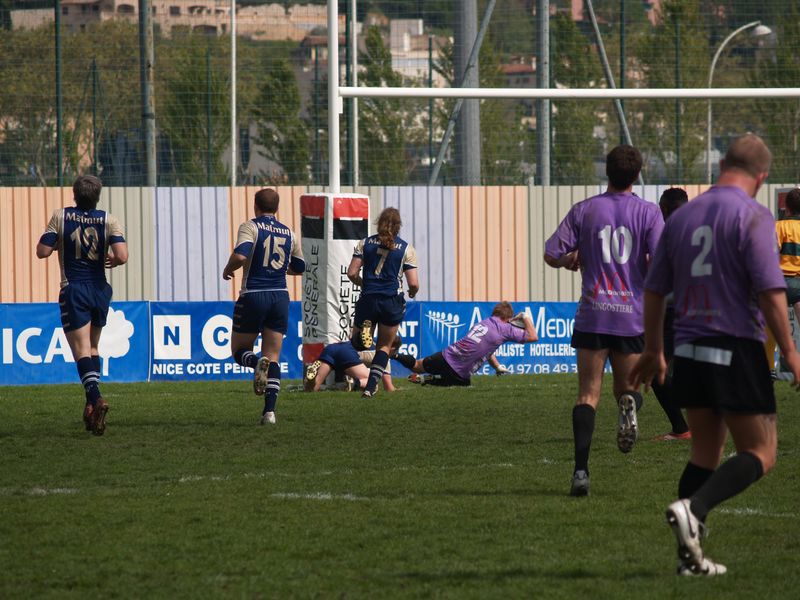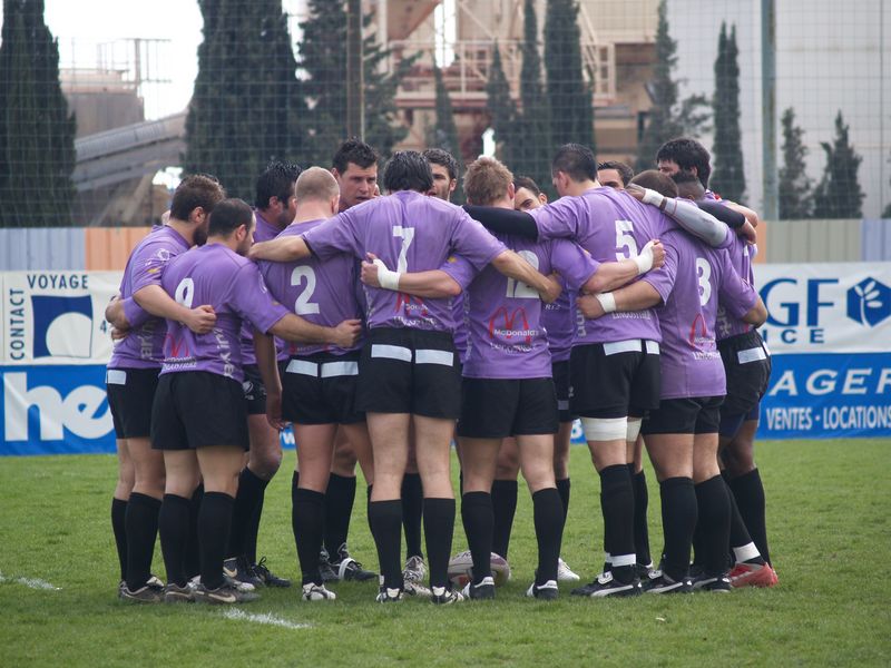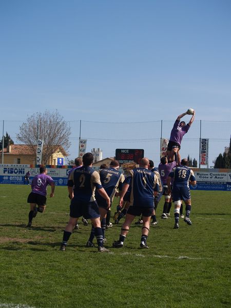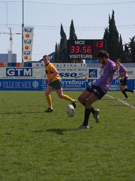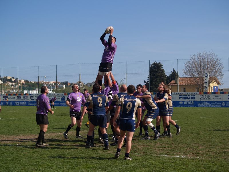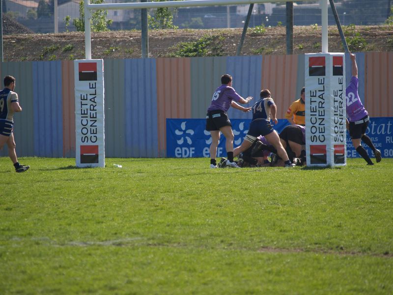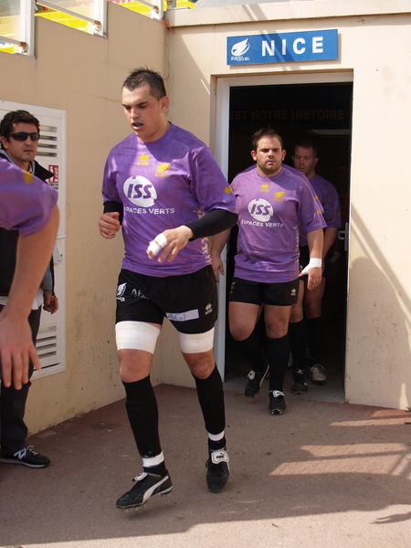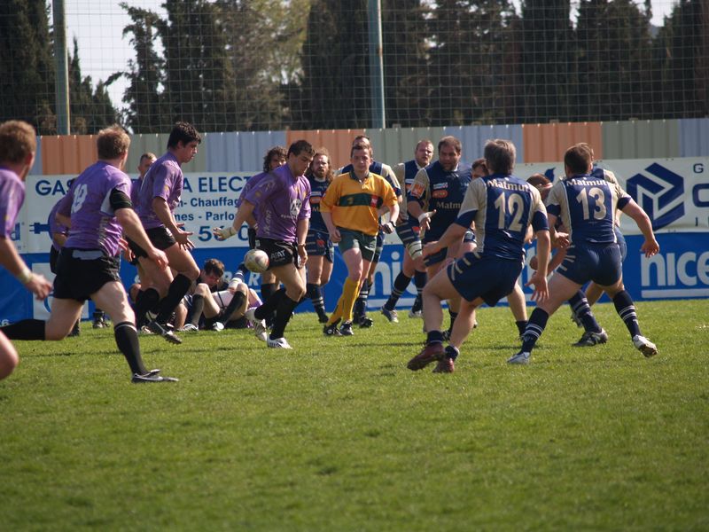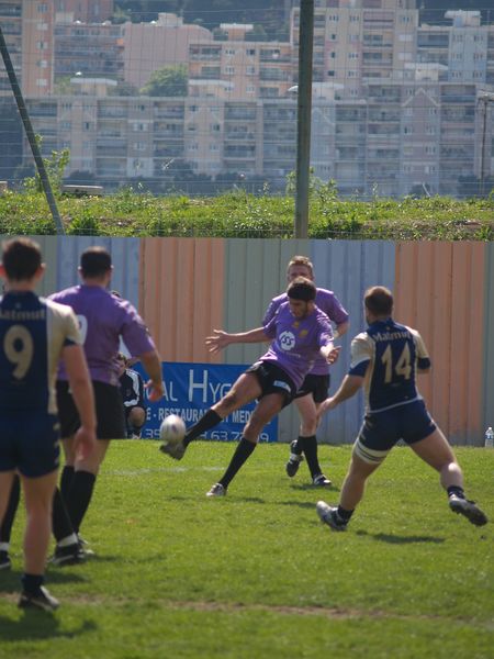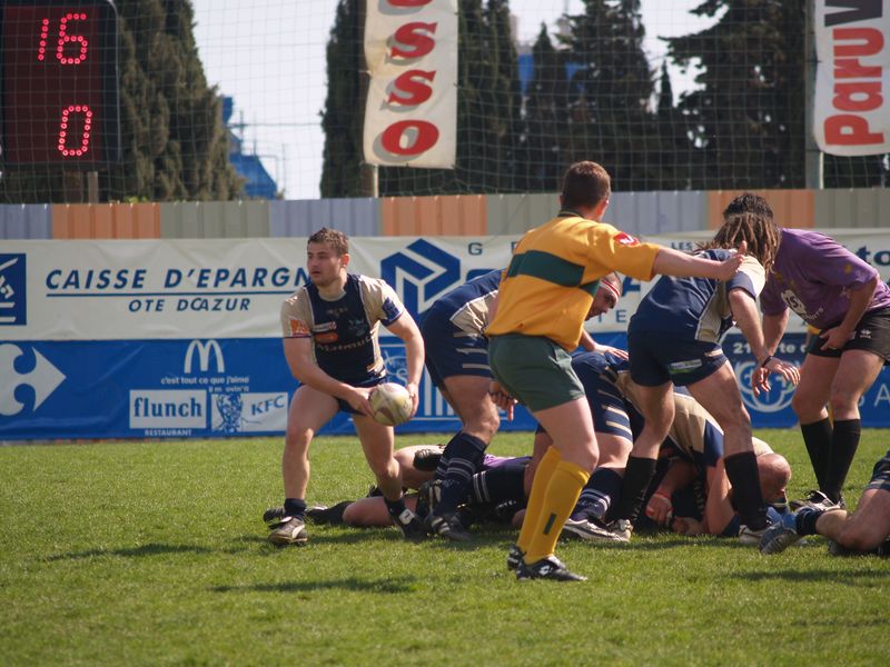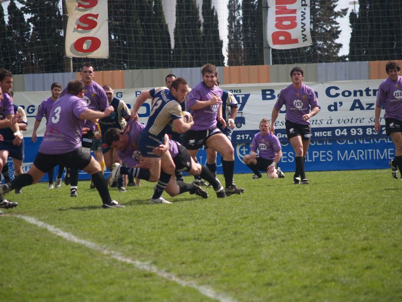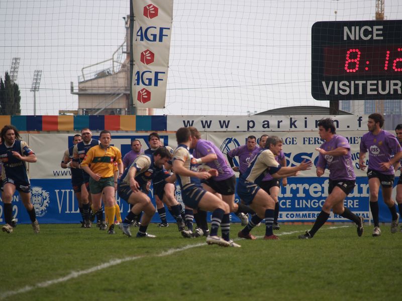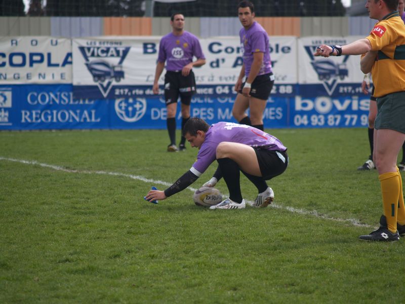 La tribune des Arboras était bien garnie sous le doux soleil printanier et les deux équipes entrent sur le terrain avec des états d’âmes bien différents. Les rouennais joueront l’an prochain en fédérale 1 alors que les niçois espèrent en un repêchage du meilleur troisième pour rejoindre leurs hôtes d’un jour. Les dix premières minutes seront à l’avantage des locaux et c’est en toute logique que Julien Caminati ajuste la première pénalité « entre les pagelles » pour ouvrir la marque : 3-0. La pression est violette avec un jeu bien léché et des phases de jeu bien construites. Personne ne sera surpris à la 19ème minute quand Moxham pointa le premier ballon derrière l’en-but rouennais avec la tranp : sformation de Caminati : 10-0. Les rouennais couraient autant derrière le score que derrière le ballon et Caminati avait même presque pitié en ratant sa première tentative de pénalité peu avant la demi-heure de jeu.
