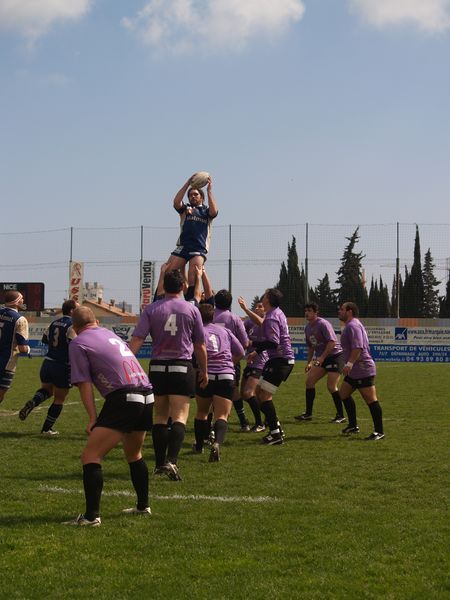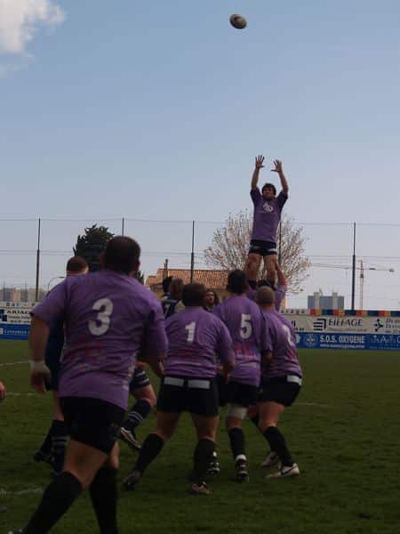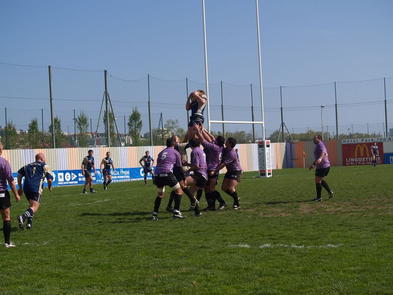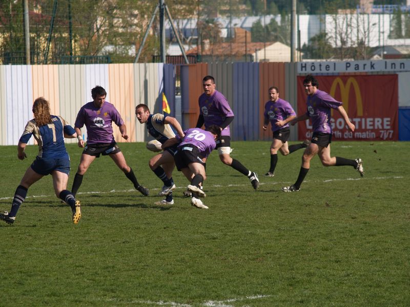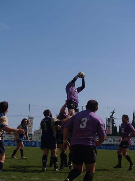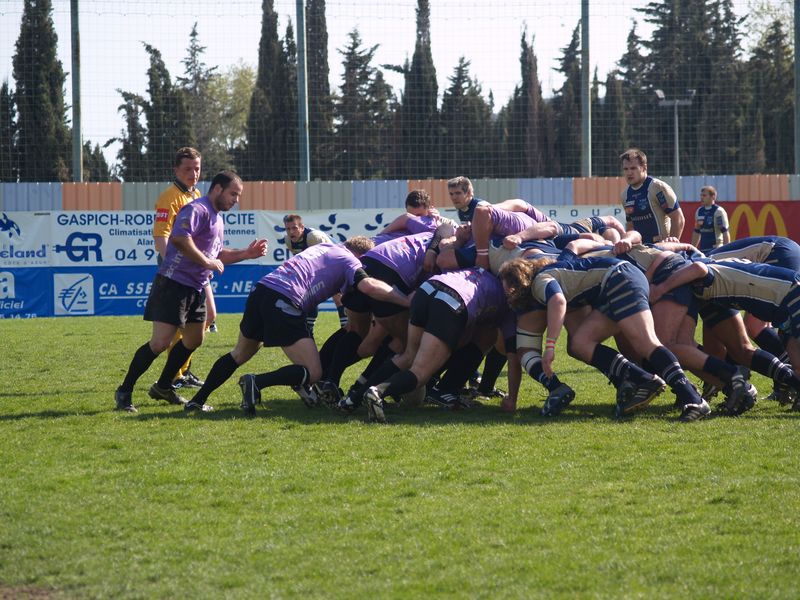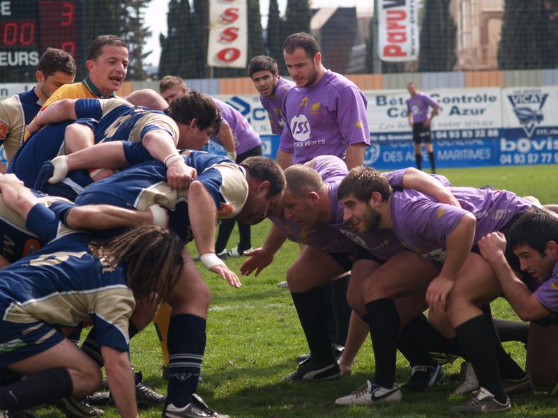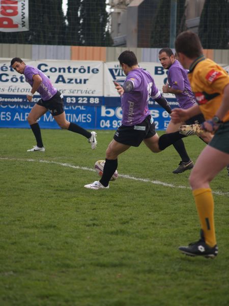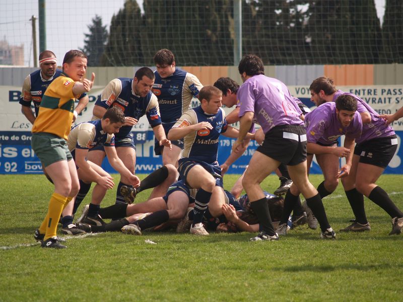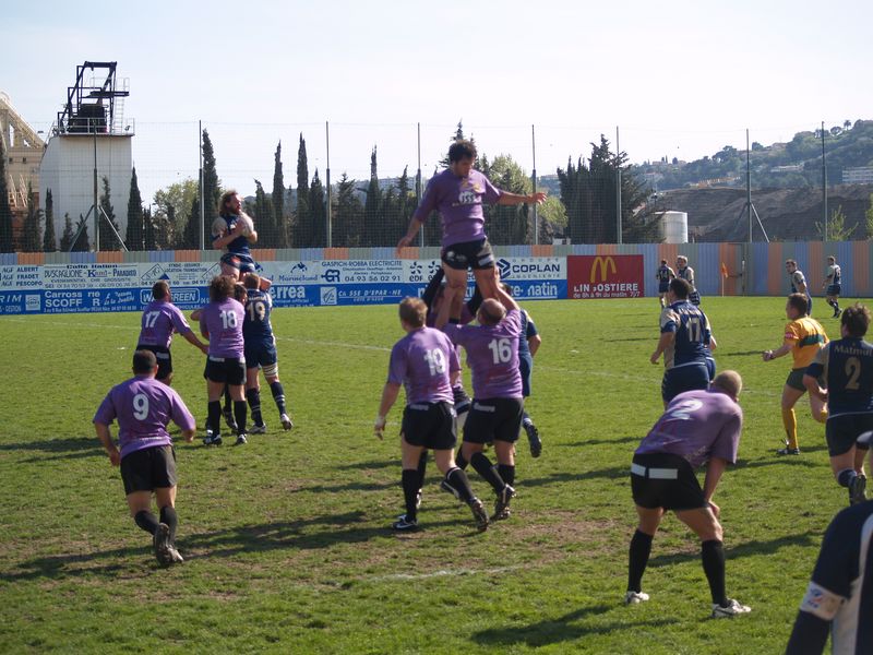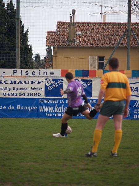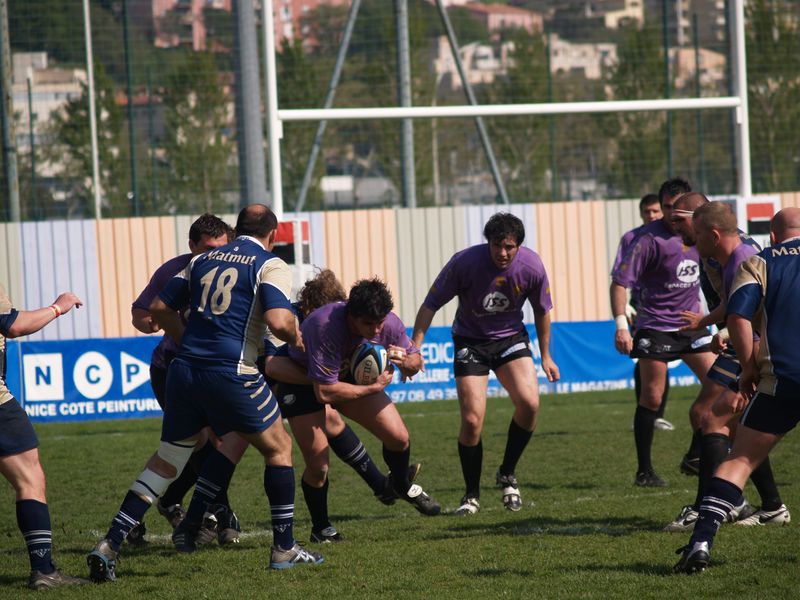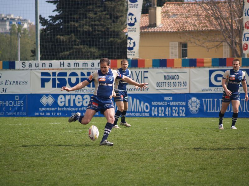La tribune des Arboras était bien garnie sous le doux soleil printanier et les deux équipes entrent sur le terrain avec des états d’âmes bien différents. Les rouennais joueront l’an prochain en fédérale 1 alors que les niçois espèrent en un repêchage du meilleur troisième pour rejoindre leurs hôtes d’un jour. Les dix premières minutes seront à l’avantage des locaux et c’est en toute logique que Julien Caminati ajuste la première pénalité « entre les pagelles » pour ouvrir la marque : 3-0. La pression est violette avec un jeu bien léché et des phases de jeu bien construites. Personne ne sera surpris à la 19ème minute quand Moxham pointa le premier ballon derrière l’en-but rouennais avec la tranp : sformation de Caminati : 10-0. Les rouennais couraient autant derrière le score que derrière le ballon et Caminati avait même presque pitié en ratant sa première tentative de pénalité peu avant la demi-heure de jeu.