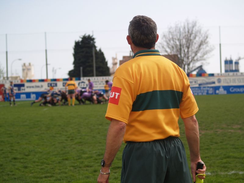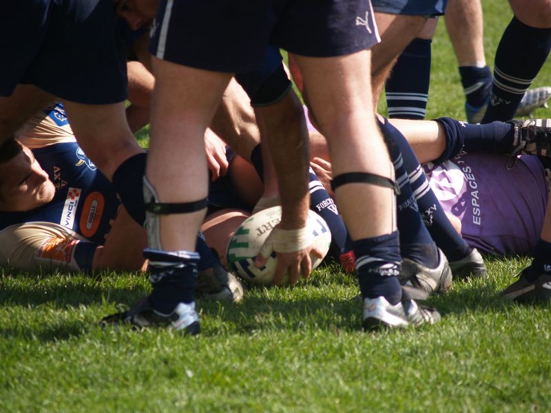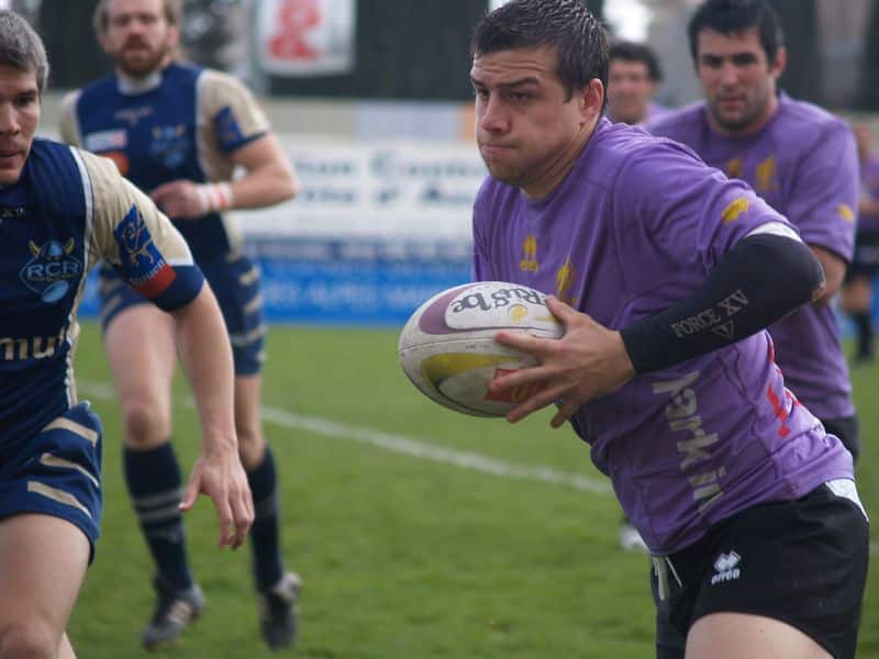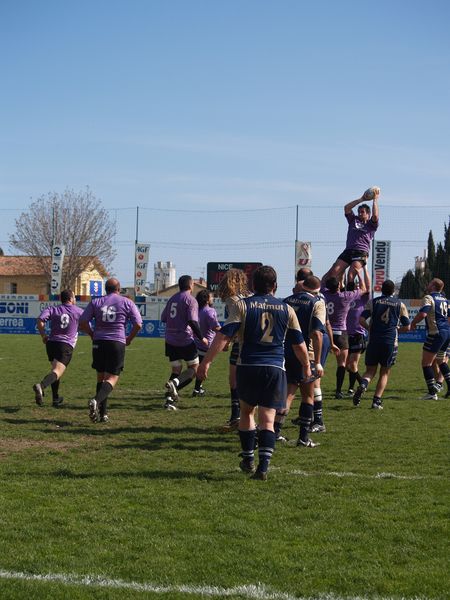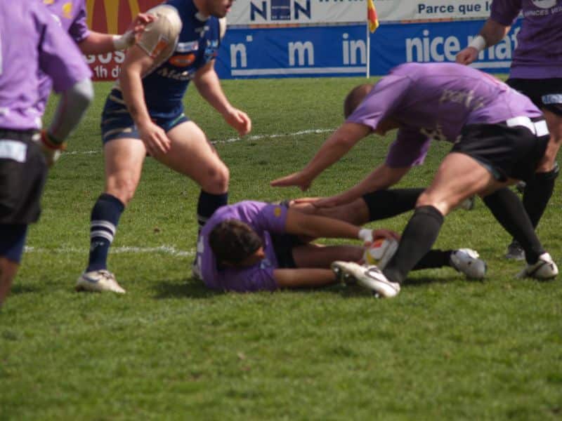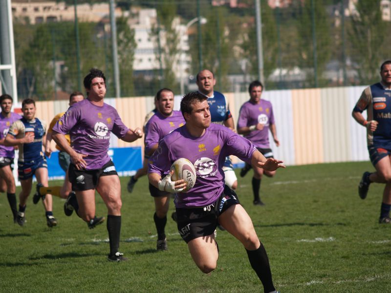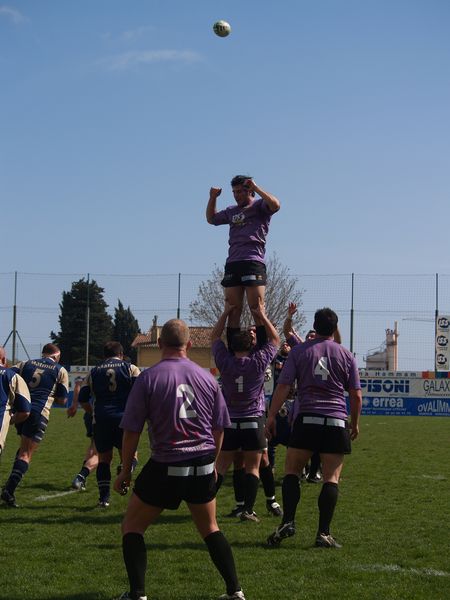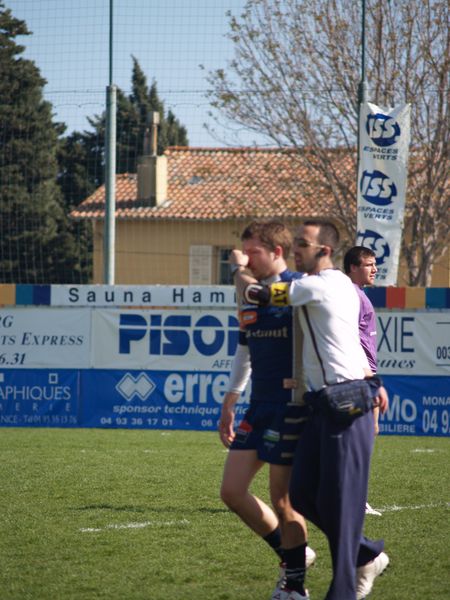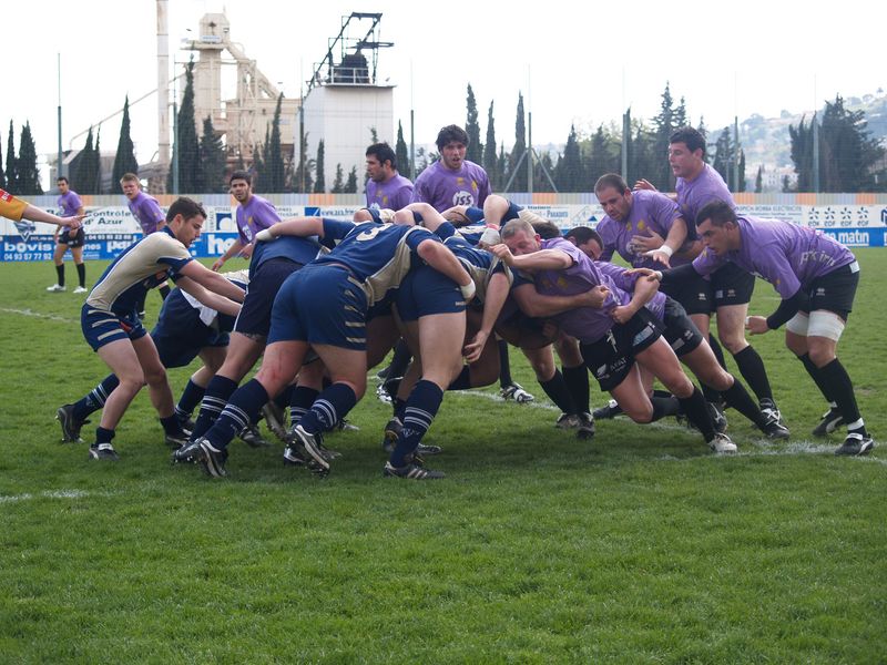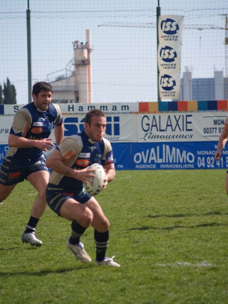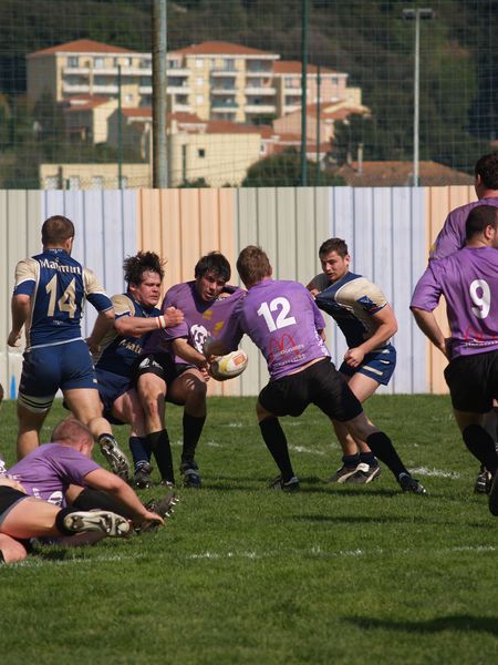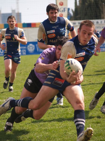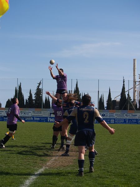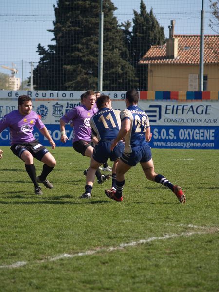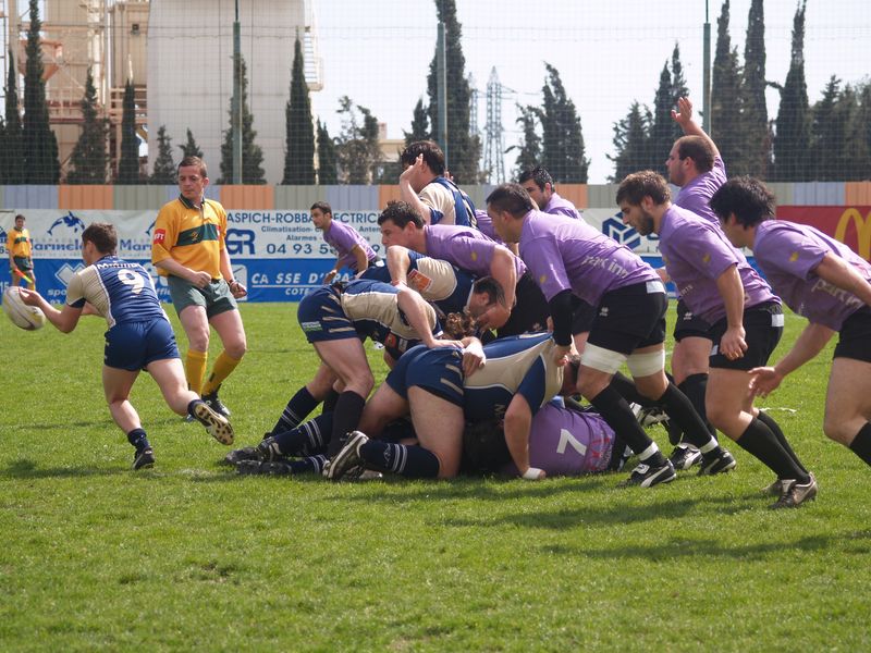 La tribune des Arboras était bien garnie sous le doux soleil printanier et les deux équipes entrent sur le terrain avec des états d’âmes bien différents. Les rouennais joueront l’an prochain en fédérale 1 alors que les niçois espèrent en un repêchage du meilleur troisième pour rejoindre leurs hôtes d’un jour. Les dix premières minutes seront à l’avantage des locaux et c’est en toute logique que Julien Caminati ajuste la première pénalité « entre les pagelles » pour ouvrir la marque : 3-0. La pression est violette avec un jeu bien léché et des phases de jeu bien construites. Personne ne sera surpris à la 19ème minute quand Moxham pointa le premier ballon derrière l’en-but rouennais avec la tranp : sformation de Caminati : 10-0. Les rouennais couraient autant derrière le score que derrière le ballon et Caminati avait même presque pitié en ratant sa première tentative de pénalité peu avant la demi-heure de jeu.
