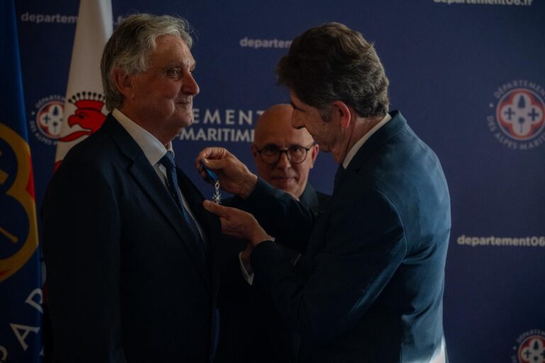 Paul Bensadoun reçoit son insigne de Chevalier de l’Ordre national du Mérite par Charles Ange Ginésy. En arrière plan, est présent Éric Ciotti.