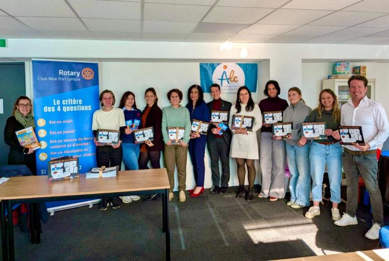 L'équipe du Rotary Club Nice Port Lympia et l'association ACL pour la remise des bandes dessinées.