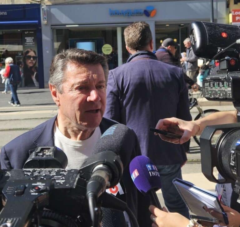 Christian Estrosi répond aux journalistes durant la campagne des municipales 2026 à Nice.