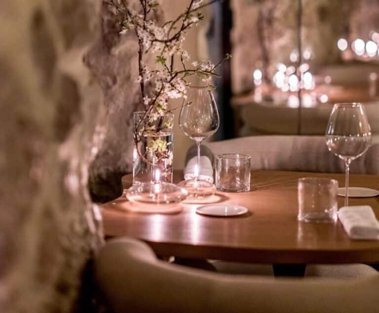 Une table chic et élégante du restaurant Les Agitateurs près du port de Nice. Avec une décoration épeurées, chic et une ambiance tamisée.