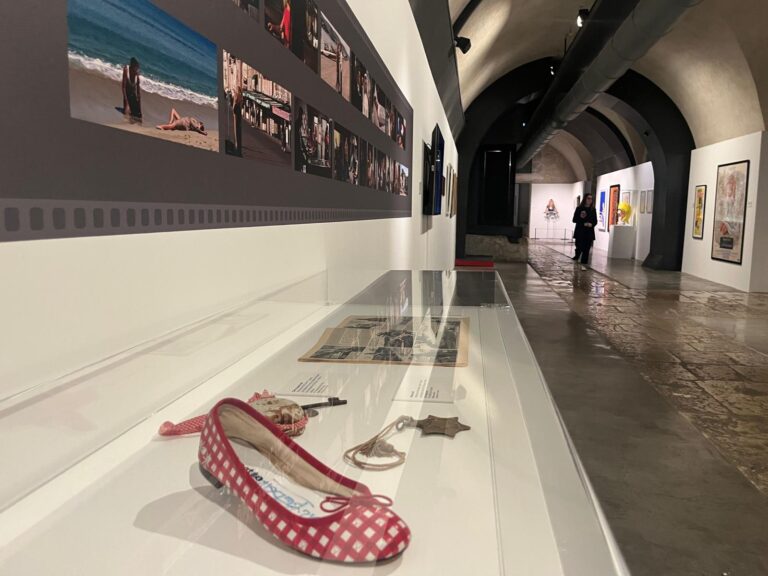 L'exposition de l'Espace Lympia : l’exposition "Brigitte, Mylène & Michèle - Les petites chéries de la Côte d’Azur" avec des objets comme une chaussure et photos iconiques des stars dans la galerie.