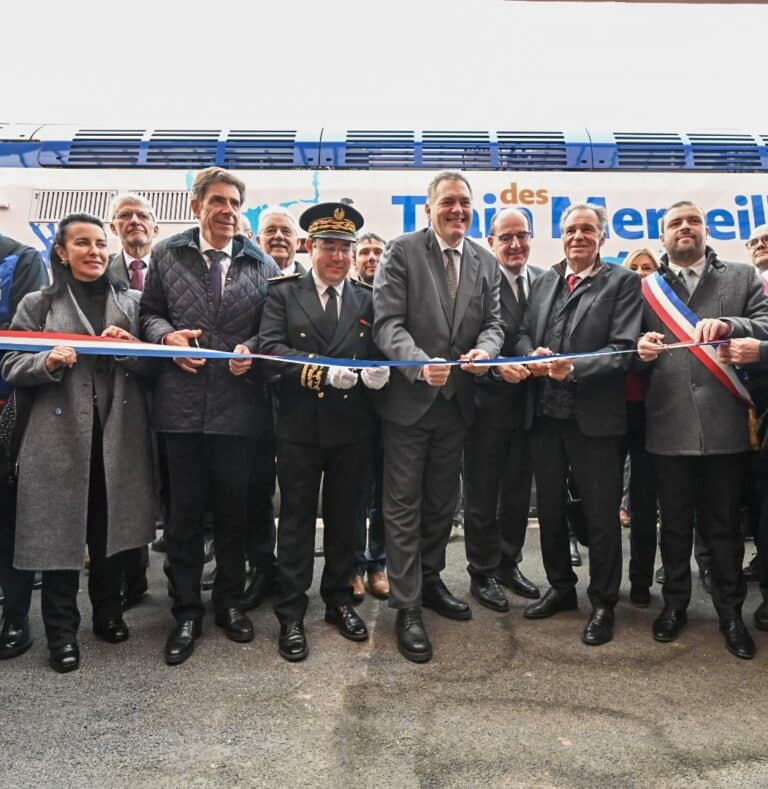 Les élus lors de l'inauguration de la ligne Nice -Breil- Tende qui coupent un ruban bleu blanc rouge.